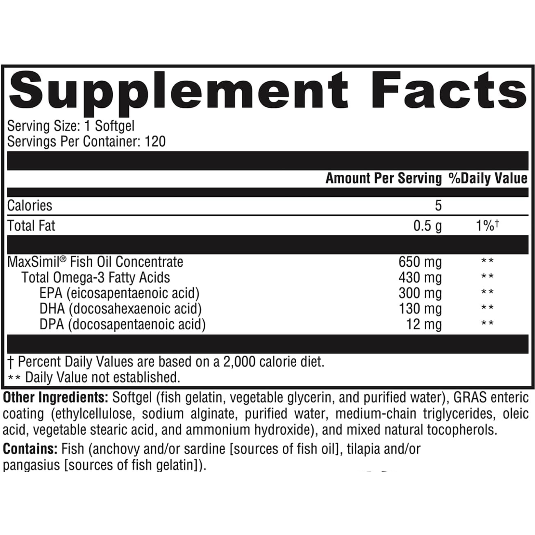 Omega MonoPure® 650 EC features natural enzymatically enhanced MaxSimil® monoglyceride fish oil that has a three times greater EPA/DHA absorption rate than an equivalent dose of ethyl ester fish oil. This translates to less fish oil in a smaller softgel for easy swallowing. This IFOS five-star certified fish oil outperforms other fish oils through MaxSimil patented lipid absorption enhancement technology (PLATform).*