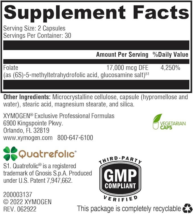 - 5 MTHF capsule formulated to exclude: Wheat, gluten, corn, yeast, soy, animal and dairy products, fish, shellfish, peanuts, tree nuts, egg, ingredients derived from GMOs and artificial preservatives. XYMOGEN methylated folate and vitamin b supplements are practitioner trusted.