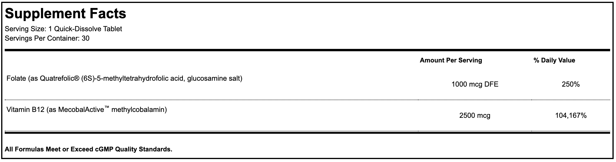 Biologically active folate and B12 in great-tasting, quick-dissolve tablet form.- Features Quatrefolic and methylcobalamin. Quatrefolic is the glucosamine salt of 5-MTHF - the most biologically active form of folate that increases plasma folate more effectively than folic acid.*