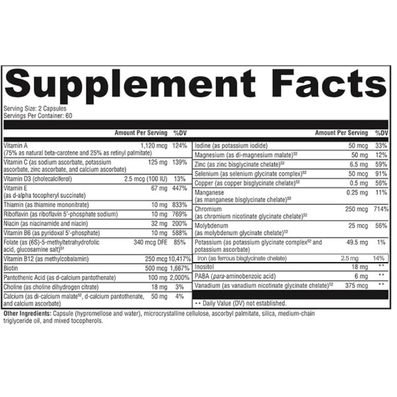 Alive + Well offers our essential multivitamin featuring a premium, multivitamin/mineral blend of high-quality vitamin and mineral forms selected for optimum utilization. The comprehensive nutrient profile is delivered in a vegetarian capsule and supports foundational wellness; provides antioxidant activity with vitamins C and E, selenium, and beta-carotene; and supports detoxification.*
