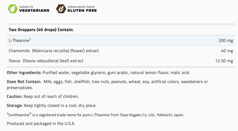 L-Theanine is a naturally occurring, unique amino acid found in green tea leaves. Alive + Well’s L-Theanine is Suntheanine®, the most respected source and the one which has been used in scientific studies. L-Theanine may promote a sense of relaxation without causing drowsiness.* It has also been found to promote healthy cellular function and reduce feelings of stress and anxiety.* Relaxation support is enhanced by the synergistic effects of the added chamomile extract.*