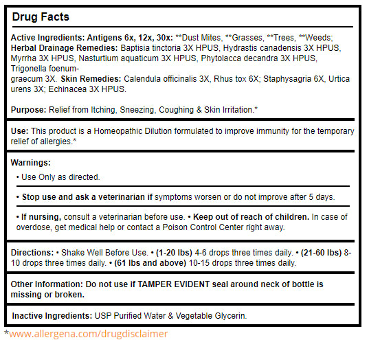 Allergena is a Homeopathic Immunotherapy that reduces your pet’s negative reaction to allergens. Allergena homeopathic allergy