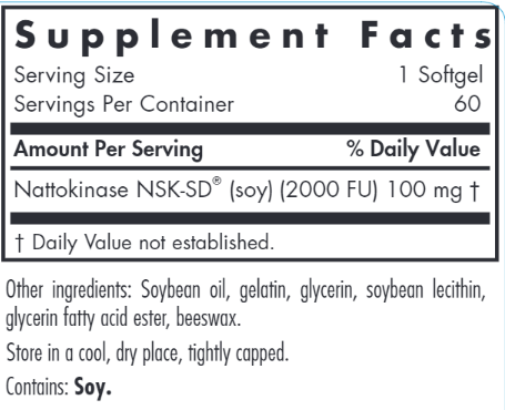 Isolated, purified and encapsulated nattokinase, an enzyme derived from boiled soybeans and a selected, patented strain of Bacillus subtilis natto. Nattokinase NSK-SD® was the first nattokinase introduced into the US market, and it has established standardization and quality levels for all nattokinase, with comprehensive safety studies and proven potency. It is vegetarian, non-irradiated, and free of vitamin K2. NSK-SD® has two Japanese and three U.S. patents, and is recognized by the JHFA (Japan Health and Nutrition Food Authorization) and JNKA (Japan Nattokinase Association) as authentic nattokinase. NSK-SD® is a trademark of Japan BioScience Laboratory.