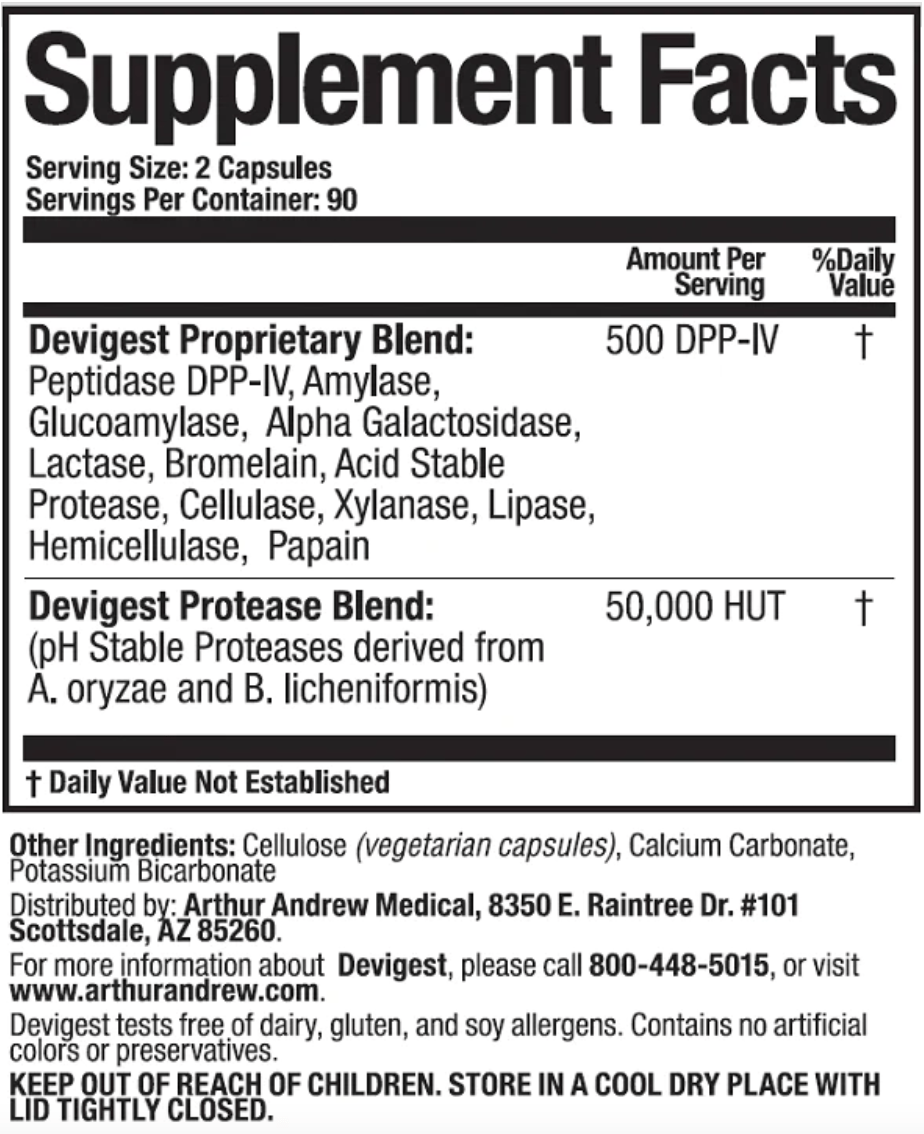 Take Devigest with eight ounces of water at the beginning of each meal or as directed by your healthcare provider. Additional capsules can be taken during periods of occasional discomfort.