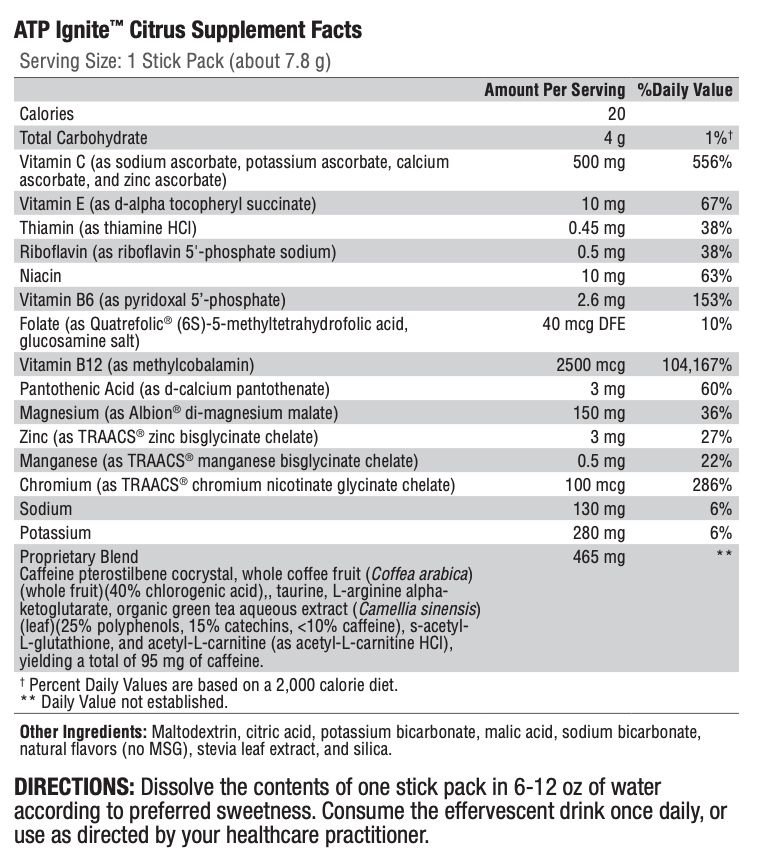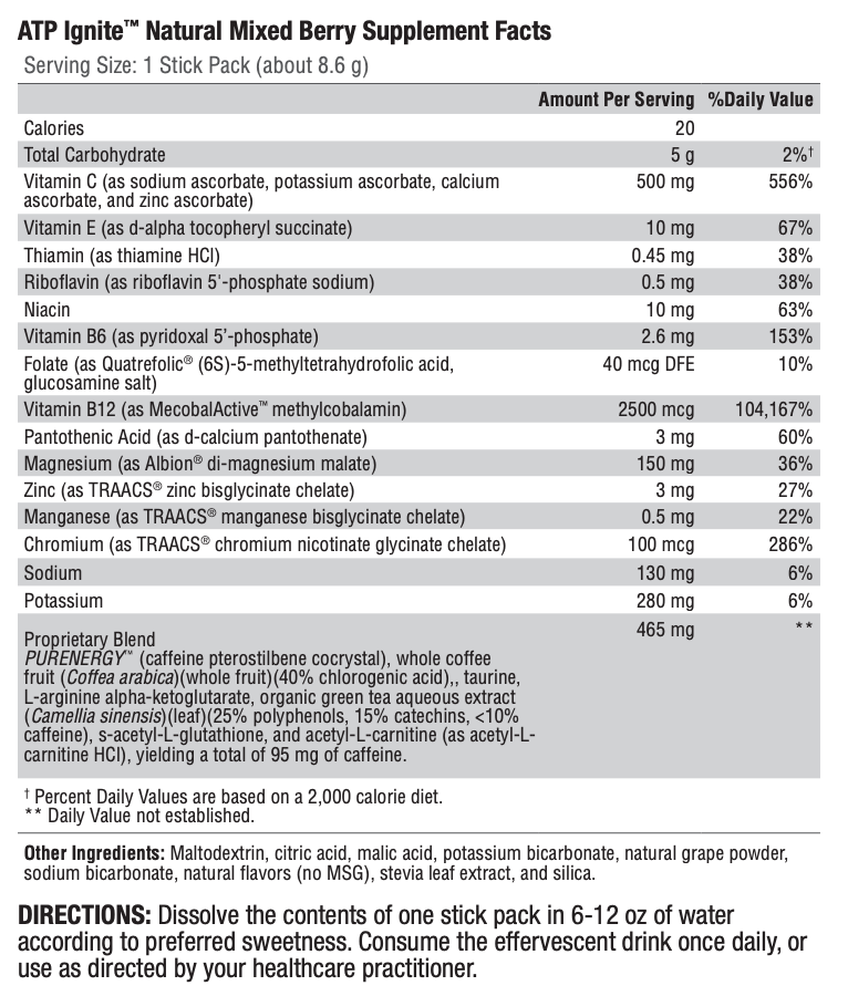 ATP Ignite™ transforms water into a great-tasting, revitalizing energy drink. Each stick provides a combination of B vitamins, electrolytes, trace minerals, amino acids, herbs, and antioxidants to fuel your body’s energy production. Building on these important nutrients, ATP Ignite also features Purenergy™, a technology-driven, patent-protected ingredient that combines caffeine and pTeroPure® pterostilbene. Initial reports suggest that Purenergy’s caffeine may be absorbed more slowly and stay in your system longer than regular caffeine, which may help your energy last longer. With just 5 g of carbohydrate per serving and zero sugars, ATP Ignite simply gives your body what it needs to produce energy.