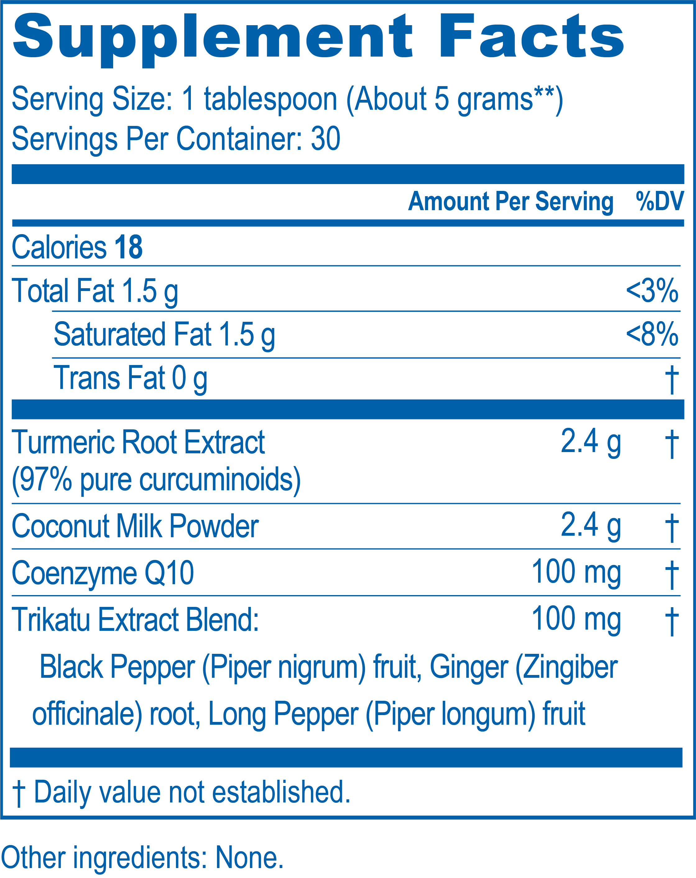 CoCurcuminâ„¢ is a natural coconut flavored drink mix that uses traditional methods to enhance the bioavailability of curcuminoids. Curcumin is difficult for the body to absorb. Absorption of curcumin has been shown to improve when it is consumed with fats, which enhance absorption since curcumin is highly lipophilic. Adding medium-chain triglycerides (MCTs), as we have done in our CoCurcuminâ„¢ formula, significantly improves the bioavailability of curcumin. MCTs are a unique form of dietary fat that impart a wide range of positive health benefits including supporting fat metabolism and energy production. Trikatu is a traditional Ayurvedic combination for digestive health containing piperine from black pepper. Piperine has also been shown to enhance turmeric absorption.