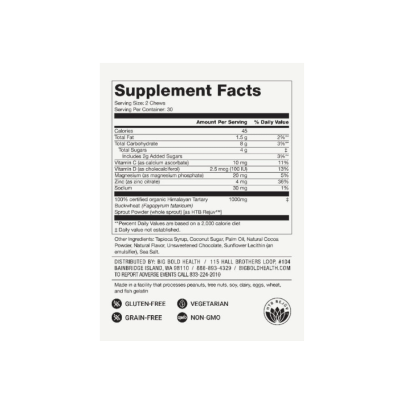 A delicious dose of organic sprouted Himalayan Tartary Buckwheat (HTB) enhanced with zinc, magnesium, vitamin C, vitamin D and cocoa for daily immune and energy support*