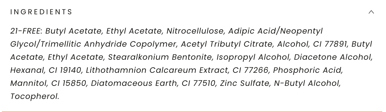 To provide a kinder option, this nail polish is vegan, 77% plant-based and 21-FREE, meaning it's free from 21 toxic ingredients normally found in nail polishes. Now you can enjoy beautiful colored nails while respecting animals, the environment and yourself! ☺