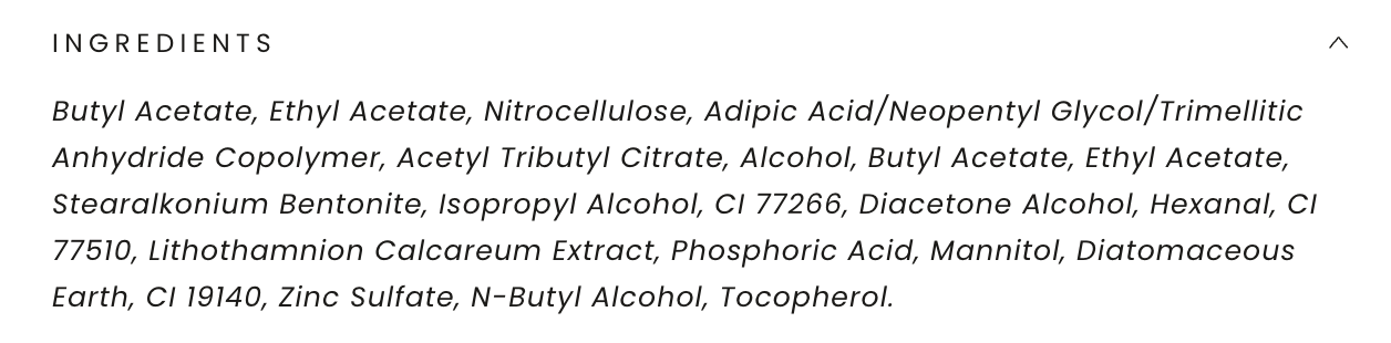 The majority of nail polishes on the market contain multiple toxic ingredients that can be harmful to health. Also, while this information is often not shared, many nail polishes unfortunately contain animal-derived ingredients. For example, cochineal insect pigment is sometimes used to make reds more vivid, or guanine crystals, from fish scales or chameleons, are used to add luster and shine in cosmetics.