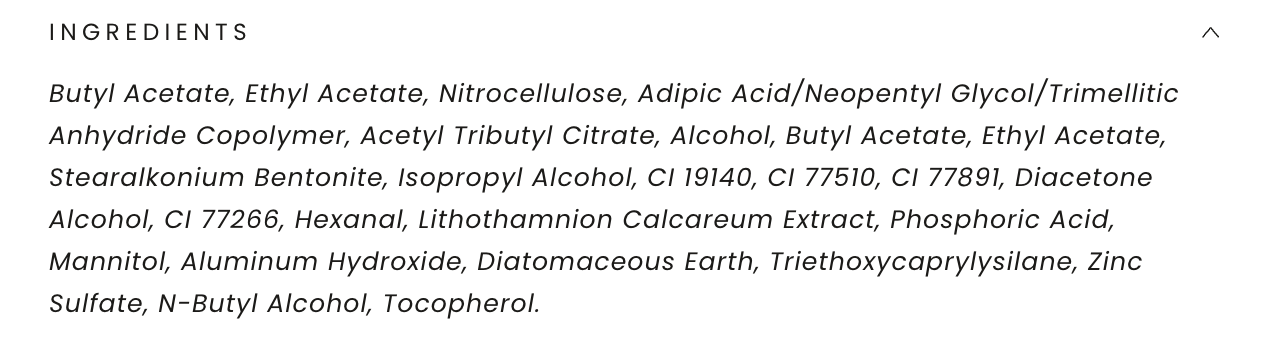 The majority of nail polishes on the market contain multiple toxic ingredients that can be harmful to health. Also, while this information is often not shared, many nail polishes unfortunately contain animal-derived ingredients. For example, cochineal insect pigment is sometimes used to make reds more vivid, or guanine crystals, from fish scales or chameleons, are used to add luster and shine in cosmetics.