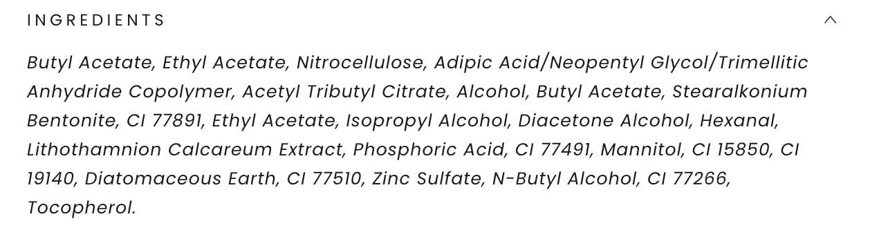 The majority of nail polishes on the market contain multiple toxic ingredients that can be harmful to health. Also, while this information is often not shared, many nail polishes unfortunately contain animal-derived ingredients. For example, cochineal insect pigment is sometimes used to make reds more vivid, or guanine crystals, from fish scales or chameleons, are used to add luster and shine in cosmetics.