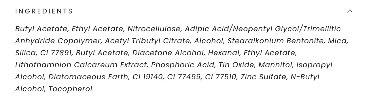 The majority of nail polishes on the market contain multiple toxic ingredients that can be harmful to health. Also, while this information is often not shared, many nail polishes unfortunately contain animal-derived ingredients. For example, cochineal insect pigment is sometimes used to make reds more vivid, or guanine crystals, from fish scales or chameleons, are used to add luster and shine in cosmetics.