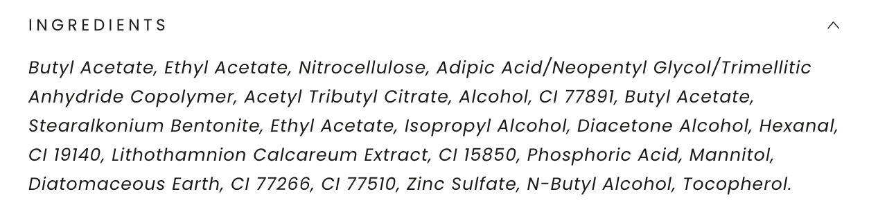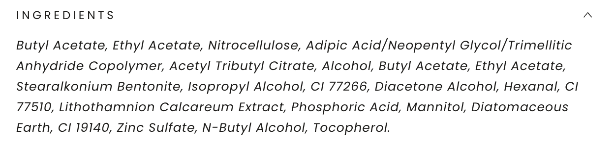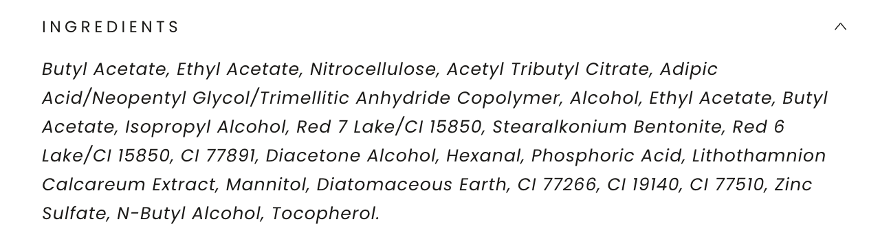The majority of nail polishes on the market contain multiple toxic ingredients that can be harmful to health. Also, while this information is often not shared, many nail polishes unfortunately contain animal-derived ingredients. For example, cochineal insect pigment is sometimes used to make reds more vivid, or guanine crystals, from fish scales or chameleons, are used to add luster and shine in cosmetics.