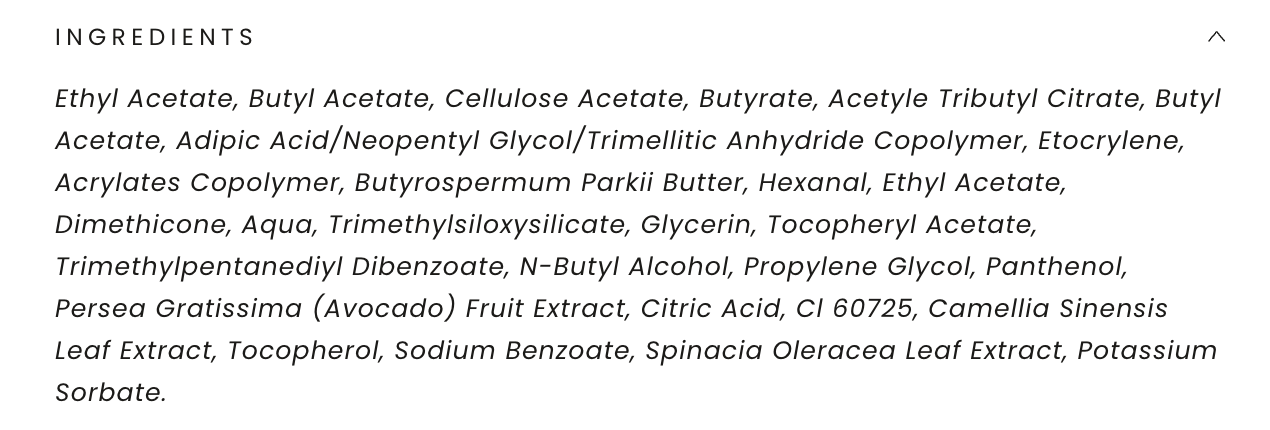 The majority of nail polishes on the market contain multiple toxic ingredients that can be harmful to health. Also, while this information is often not shared, many nail polishes unfortunately contain animal-derived ingredients. For example, cochineal insect pigment is sometimes used to make reds more vivid, or guanine crystals, from fish scales or chameleons, are used to add luster and shine in cosmetics.