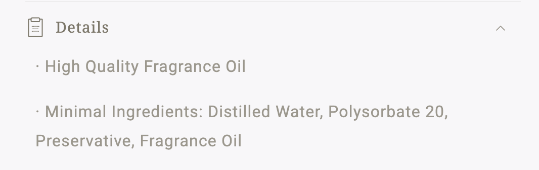 Details: - Individually sealed - High quality fragrance oil - Minimal ingredients: distilled water, polysorbate 20, preservative, fragrance oil - 4 oz. Frosted glass bottle with fine mist sprayer (5.5" tall, 2" wide)