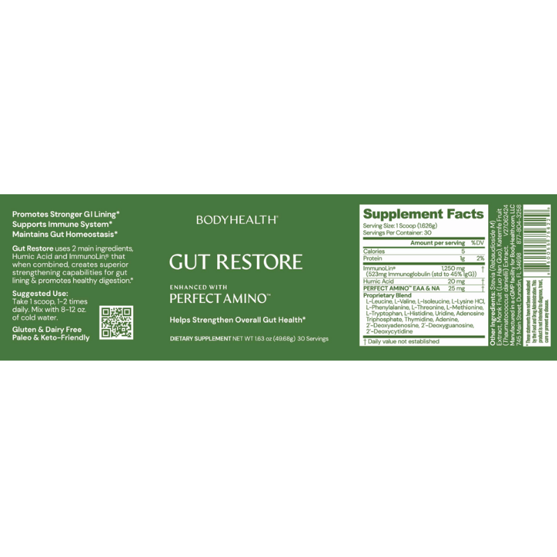 Containing both ImmunoLin® and humic acid, and fortified with PerfectAmino essential amino acids, Gut Restore binds and neutralizes over 46 different antigens in our digestive tract.