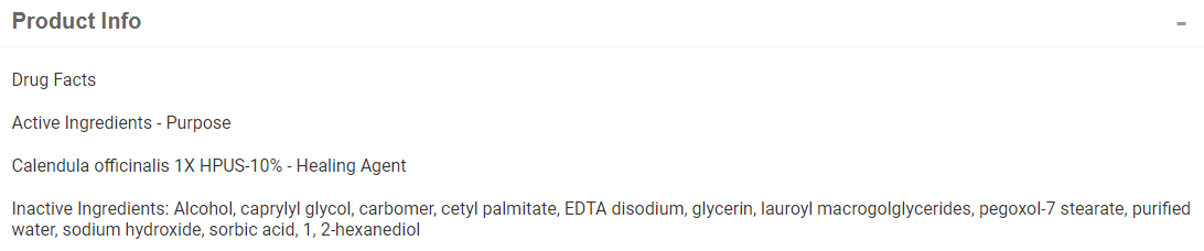Homeopathic. Helps promote healing of cuts, scrapes, chafing, minor burns and sunburn