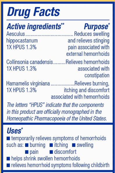 Homeopathic. Main Indication: Hemorrhoid relief.