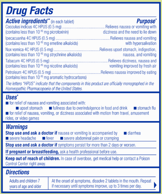 For relief of nausea and vomiting associated with: upset stomach; fullness due to overindulgence in food and drink; stomach flu; for relief of nausea, vomiting, or dizziness associated with motion from travel, amusement rides, or video games.