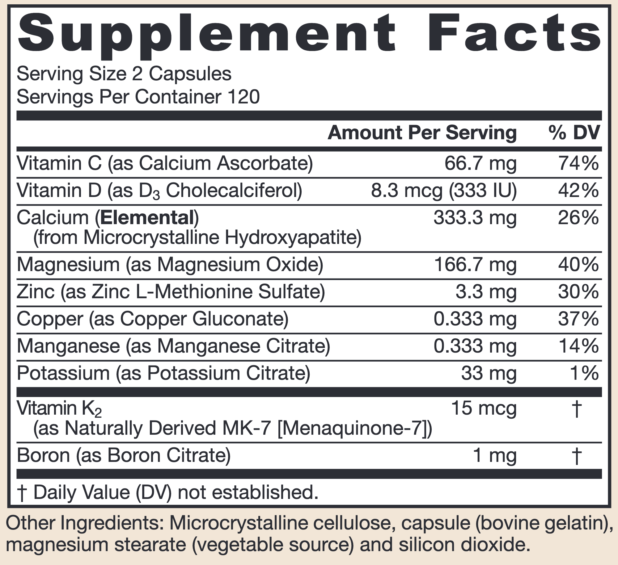BoneUp® is a comprehensive formula that provides StimuCal™ MicroCrystalline HydroxyApatite (MCHA) from free-range New Zealand calves and micronutrients to support bone health.* StimuCal™ is a naturally derived source of calcium shown to support bone mineral density better than calcium carbonate.* StimuCal™ also provides bone proteins, including type I collagen. Vitamins D3 and K2 work together to support calcium deposition into bones.*