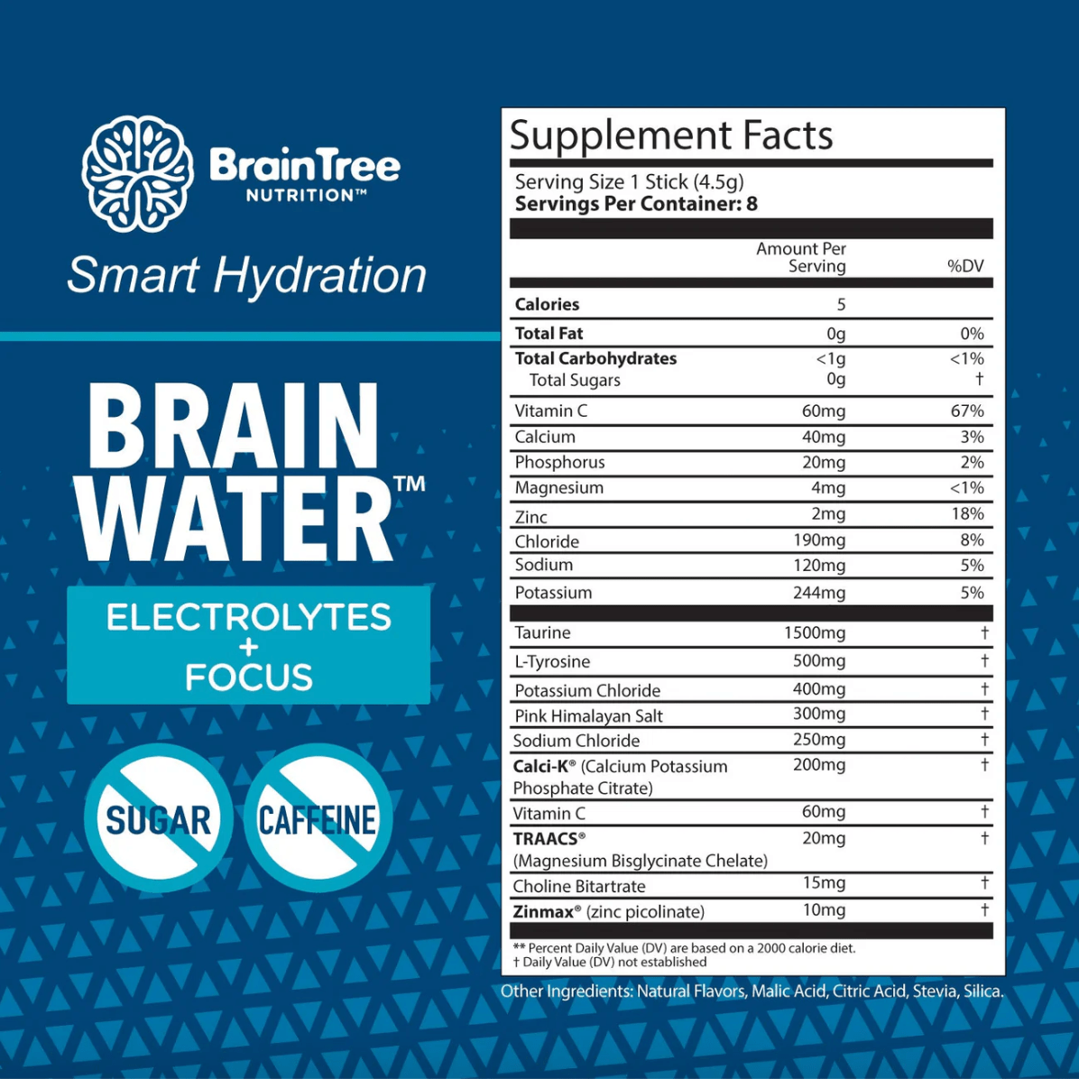Brain Water is more than just a hydration beverage; it's a cognitive-boosting elixir designed to support both your body and mind. By providing a unique blend of essential electrolytes like sodium, potassium, magnesium, zinc, calcium, phosphorus, and pink Himalayan salt, along with cognitive-enhancing ingredients like choline, L-Tyrosine, and Taurine, Brain Water helps optimize physical performance while enhancing mental clarity, focus, and overall cognitive function.