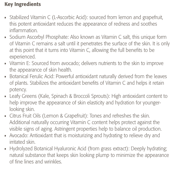 Fast-absorbing, advanced serum for all skin types. This potent dose of non-irritating Vitamin C is stabilized by botanically-derived ferulic acid to deliver optimal antioxidant benefits and improve the appearance of skin.