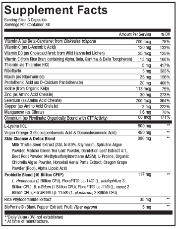 Codeage Clearface is an all-in-one formula featuring vegan vitamin A as 100% Beta-Carotene, vitamin C, vitamin D3 from wild harvested lichen, and vitamin E from rice bran combined with 30 mg of zinc along with selenium, copper, manganese, and chromium. This supplement also provides thiamin (vitamin B1), riboflavin (vitamin B2), niacin as niacinamide, and 20mg of pantothenic acid, 500mg of L-Lysine HCL and 450mg of vegan omega-3 fatty acids. Each serving offers a probiotic blend delivering 10 billion CFU with 5 different strains and a variety of skin botanicals such as milk thistle extract, spirulina algae, matcha green tea, dandelion leaf, beet root powder, and more.