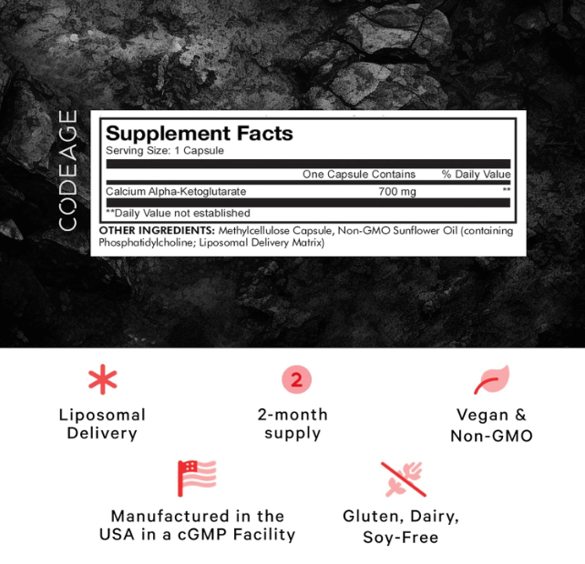 - Each bottle of Codeage Liposomal Calcium Alpha-Ketoglutarate provides 60 servings for a 2-month supply. This calcium vitamin supplement is vegan, non-GMO, dairy-free, gluten-free, and soy-free, making it suitable for individuals with specific dietary needs or preferences.