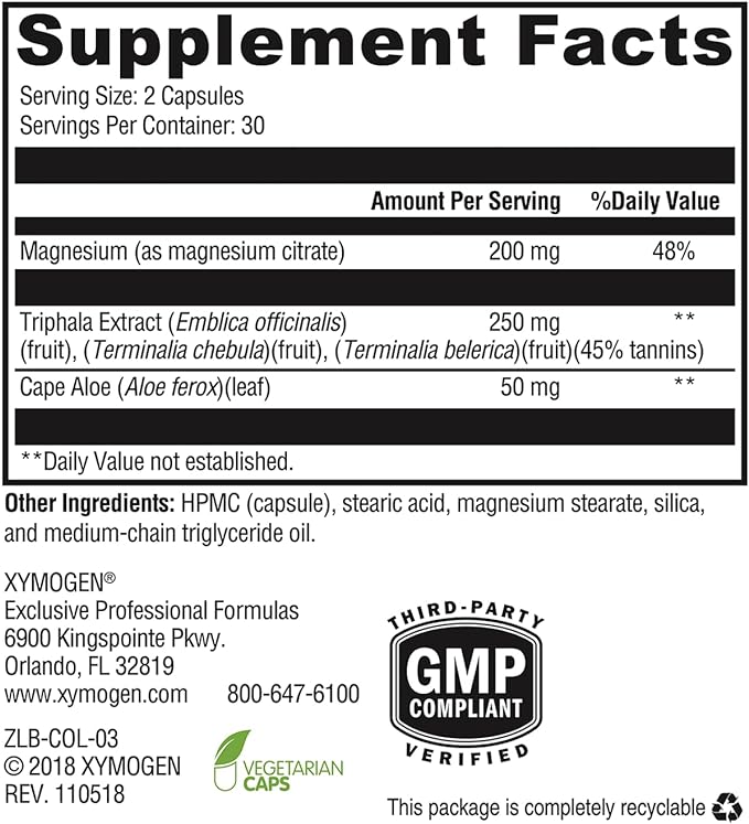 ColonX™ is designed to support gastrointestinal (GI) regularity and complement dietary fiber intake. Magnesium citrate is present to support muscle relaxation and bowel elimination. Cape Aloe is added to support normal GI transit time and stool bulk. Triphala, a balanced blend of astringent fruits used extensively in Ayurveda, is present to support all phases of digestion, assimilation, and elimination. Gastrointestinal regularity in turn plays a fundamental role in detoxification, providing a major route for elimination of toxins.