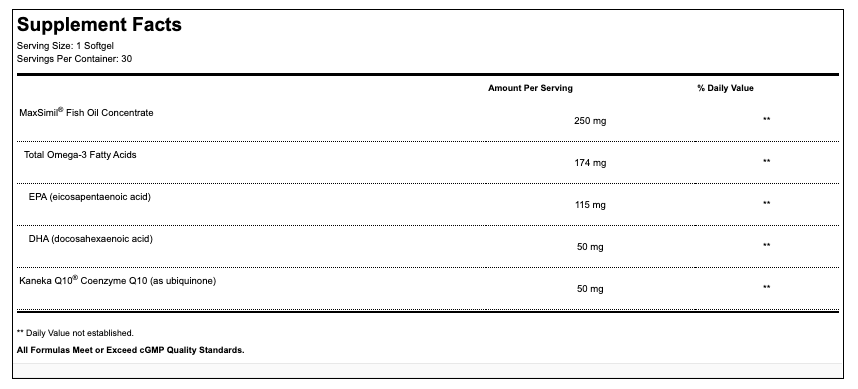 CoQmax™ Omega 50 mg provides dual-action cardiovascular support with patented ingredients selected for their individual roles in promoting heart health. MaxSimil® highly absorbable monoglyceride fish oil is International Fish Oil Standards (IFOS) five-star certified. Kaneka Q10®, a naturally pure form of bioidentical CoQ10, is well-researched for boosting energy production in the heart and protecting the cardiovascular system from oxidative stress.*