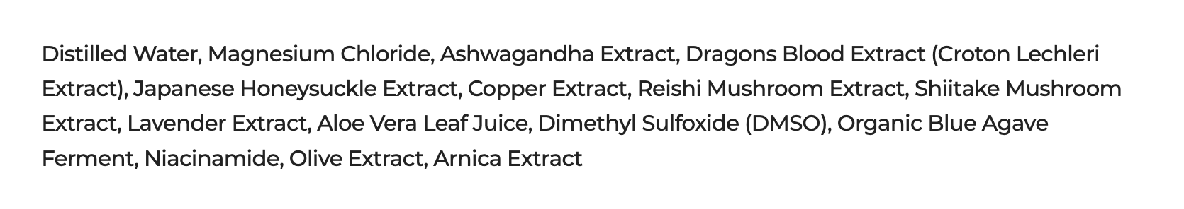 Distilled Water, Magnesium Chloride, Ashwagandha Extract, Dragons Blood Extract (Croton Lechleri Extract), Japanese Honeysuckle Extract, Copper Extract, Reishi Mushroom Extract, Shiitake Mushroom Extract, Lavender Extract, Aloe Vera Leaf Juice, Dimethyl Sulfoxide (DMSO), Organic Blue Agave Ferment, Niacinamide, Olive Extract, Arnica Extract