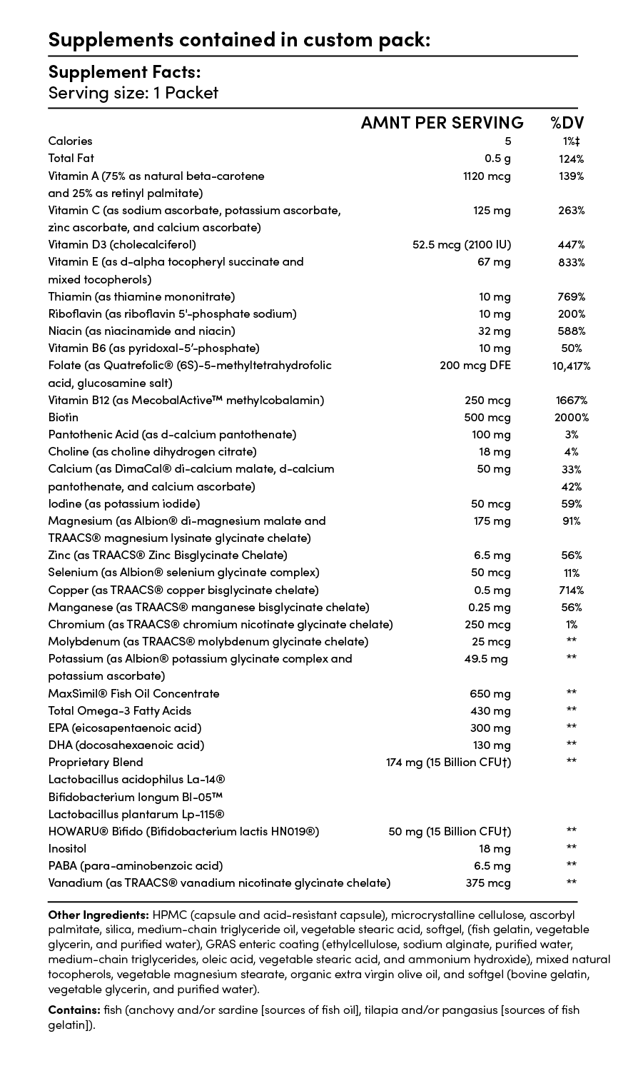 A balanced combination of nutrients for foundational wellness support, including multivitamin, omega, probiotic, vitamin D3 and magnesium in one daily pack.