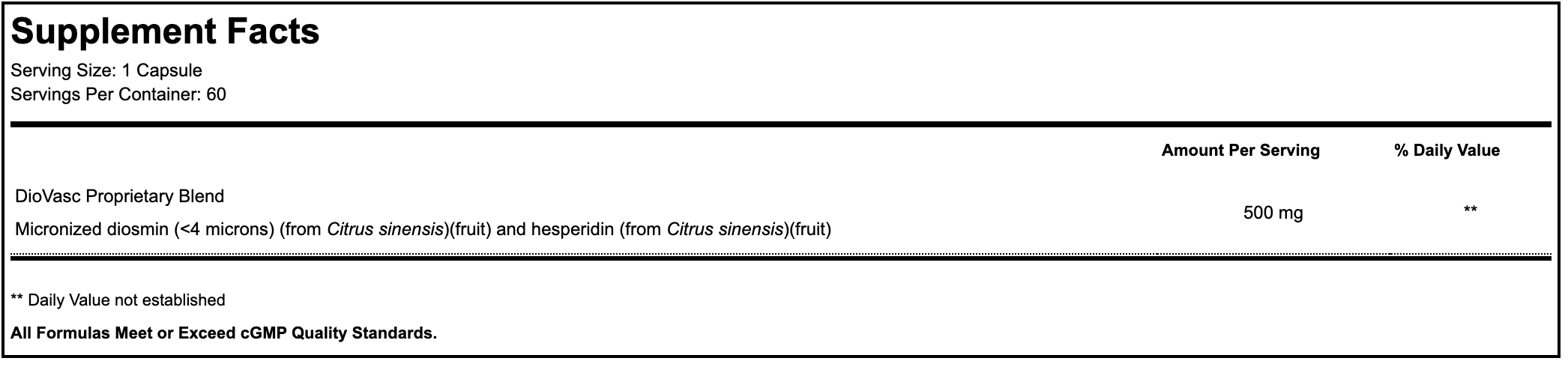 DioVasc™ contains well-researched, citrus-based flavonoids in a unique micronized form for enhanced absorption and bioavailability. Research suggests that these compounds support healthy veins, capillaries, and blood flow; promote healthy lymphatic drainage; and enhance antioxidant activity; and support healthy eicosanoid metabolism. More recent research suggests that the components in DioVasc also support blood glucose metabolism.