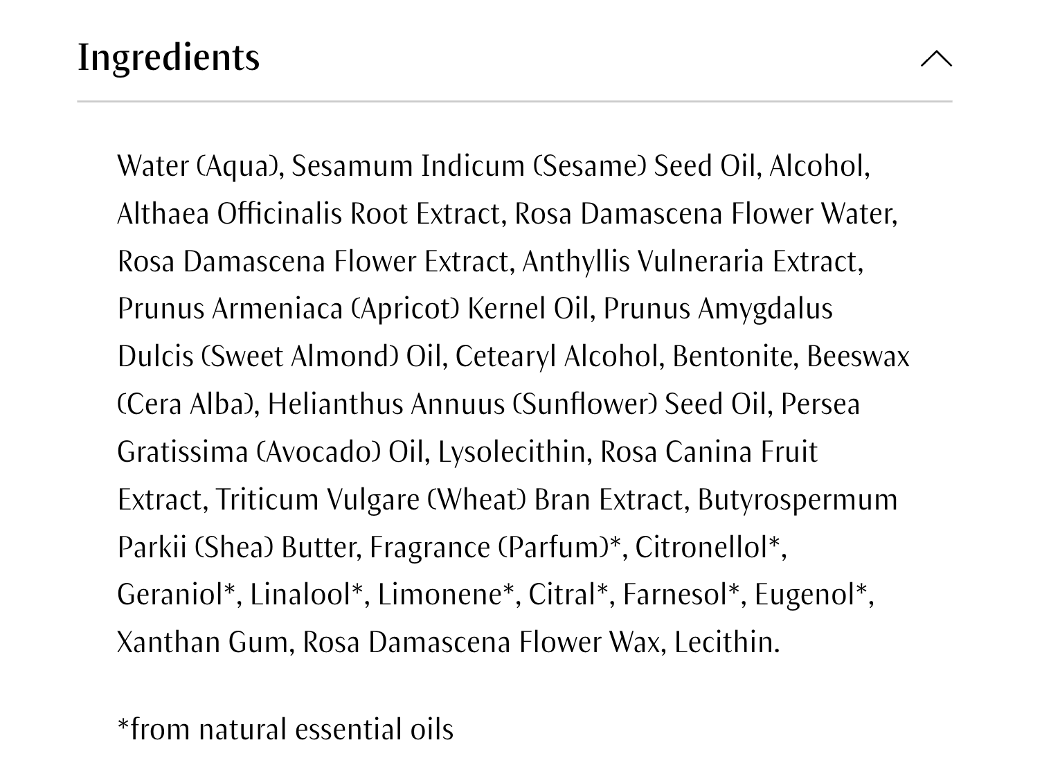 Formulation: Precious rose water, rose wax and extracts of rose, marsh mallow and anthyllis protect, calm and balance the skin. Marsh mallow root extract joins avocado, sesame and almond oils to hydrate, carrying essential moisture to the skin.