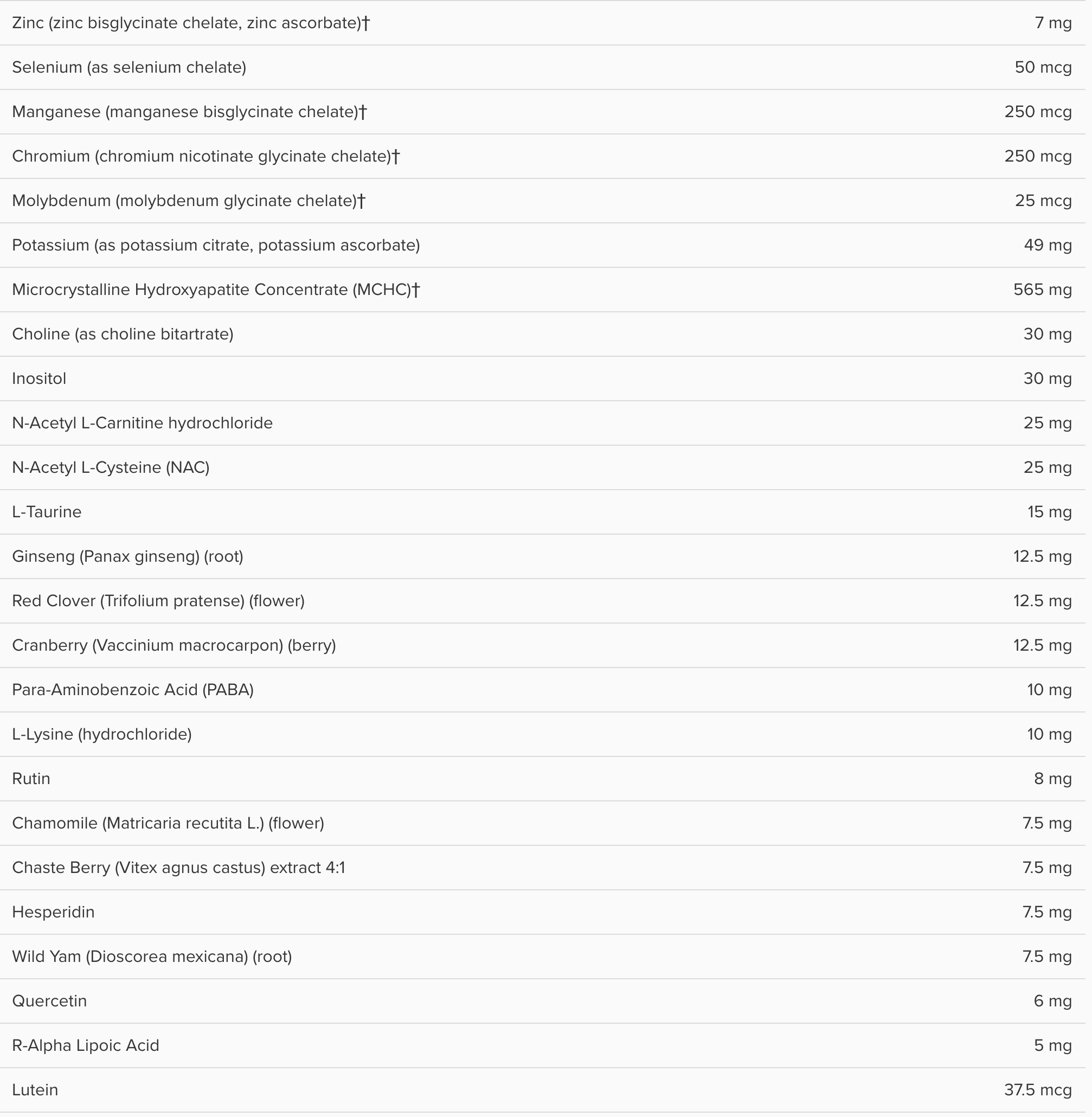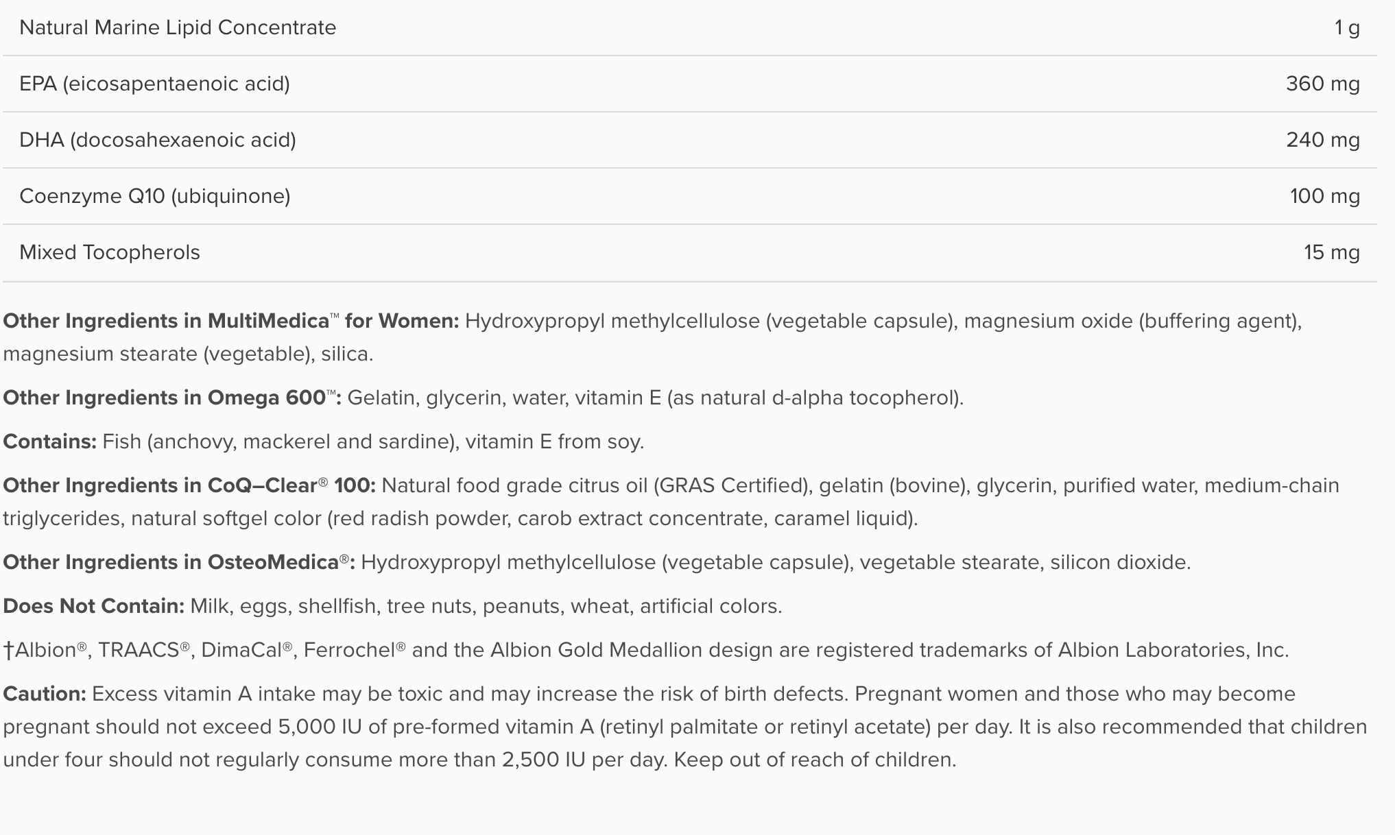 2 - MultiMedica™ for Women provides high quality comprehensive vitamins, minerals, amino acids and herbals, specifically designed to address the unique nutritional requirements of women.* MultiMedica™ for Women features patented Albion® TRAACS® amino acid chelates for optimal mineral absorption.*