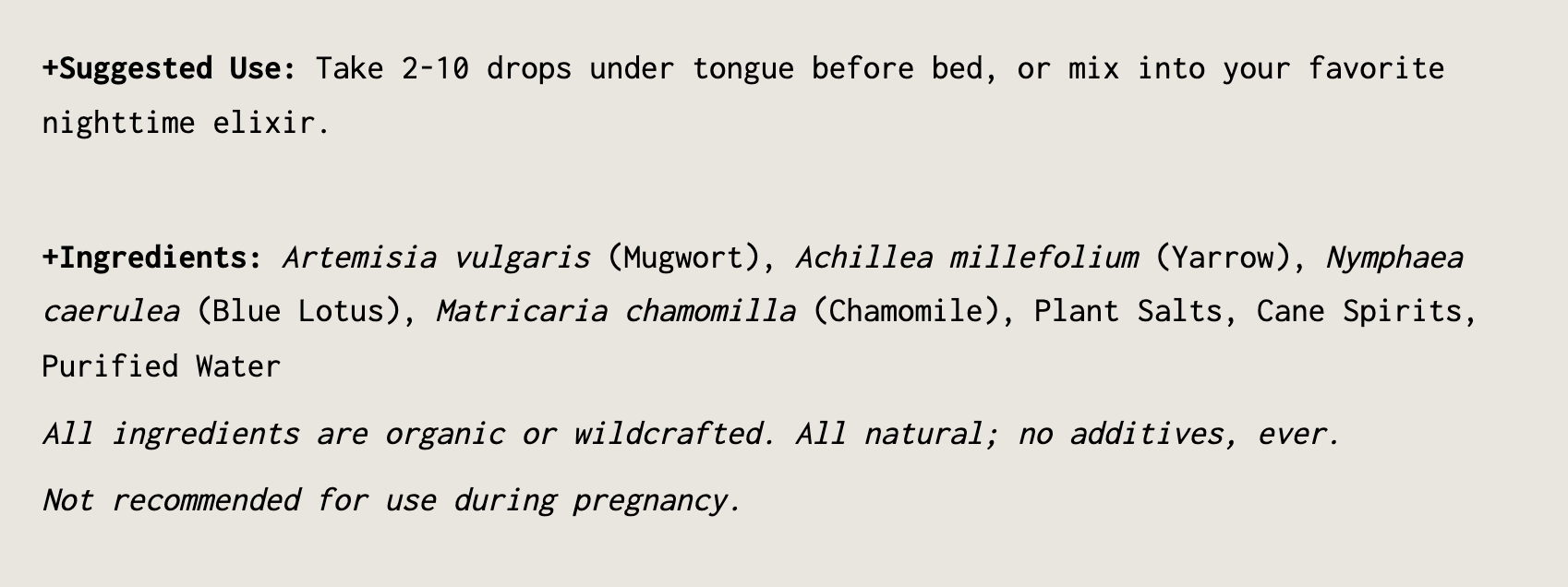 +Suggested Use: Take 2-10 drops under tongue before bed, or mix into your favorite nighttime elixir.Â