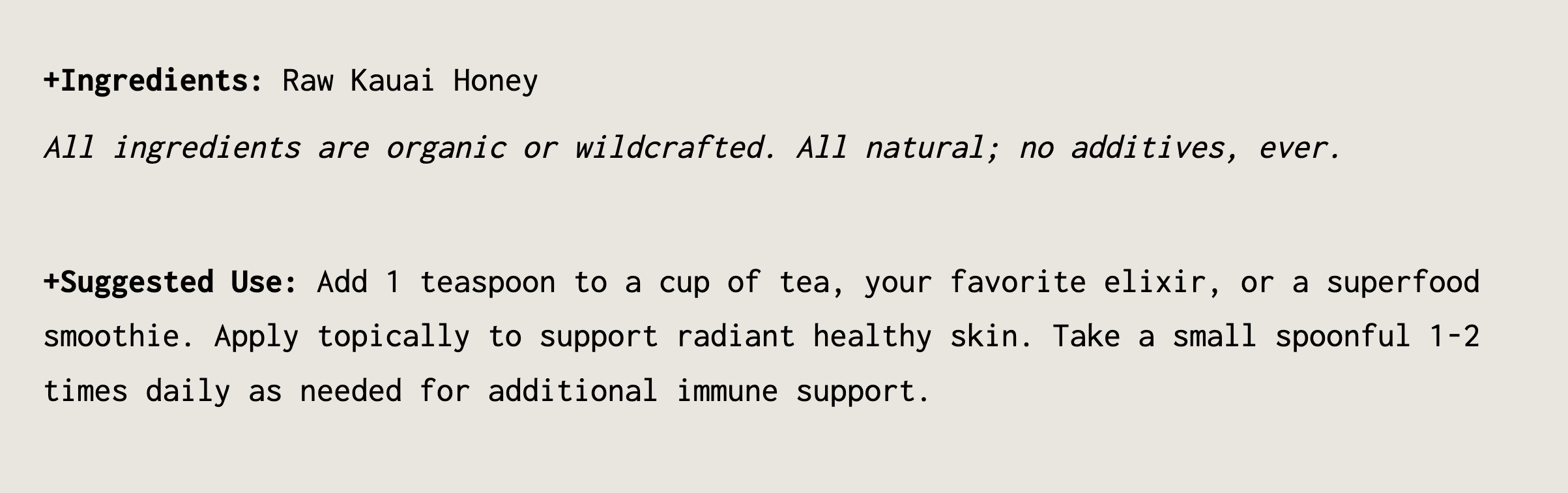 +Suggested Use:Â Add 1 teaspoon to a cup of tea, your favorite elixir, or a superfood smoothie. Apply topically to support radiant healthy skin. Take a small spoonful 1-2 times daily as needed for additional immune support.