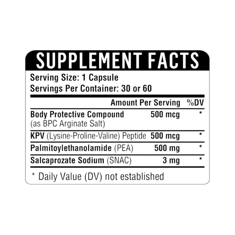 Discover the power of Body Production Compound, KPV (Lysine-Proline-Valine) and Palmitoylethanolamide (PEA) in our advanced formulation, enriched with salcaprozate sodium (SNAC) for superior absorption.