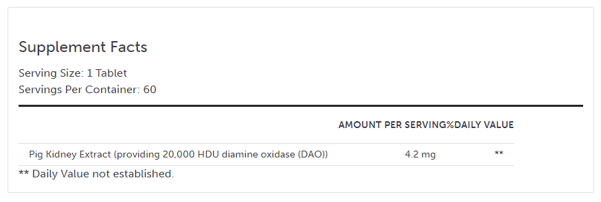 - Enhances the presence of diamine oxidase enzyme in the digestive tract. DAO is not absorbed and does not have systemic activity.*
