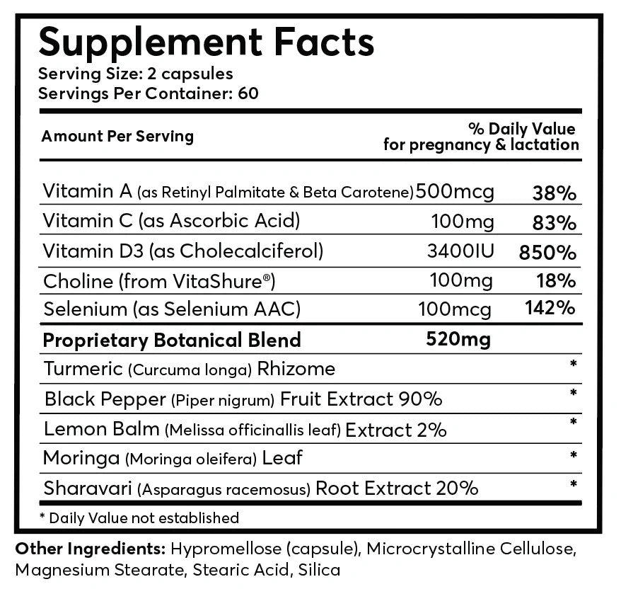 - Soothing and nourishing postpartum botanicals: Shatavari, Moringa, Curcumin, Piperine & Lemon Balm support mama's physical recovery, & postpartum hormone regulation, relieve exhaustion, & balance moods.