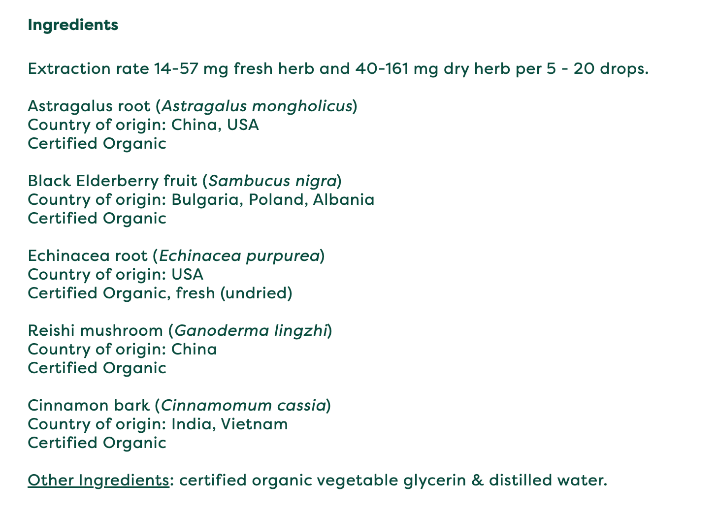 Kids Immune Fortifier features Astragalus extract produced from the root of Certified Organic Astragalus mongholicus plants. It also features Reishi extract prepared from dried whole fruiting body (not mycelium) of Certified Organic Ganoderma lingzhi mushrooms.