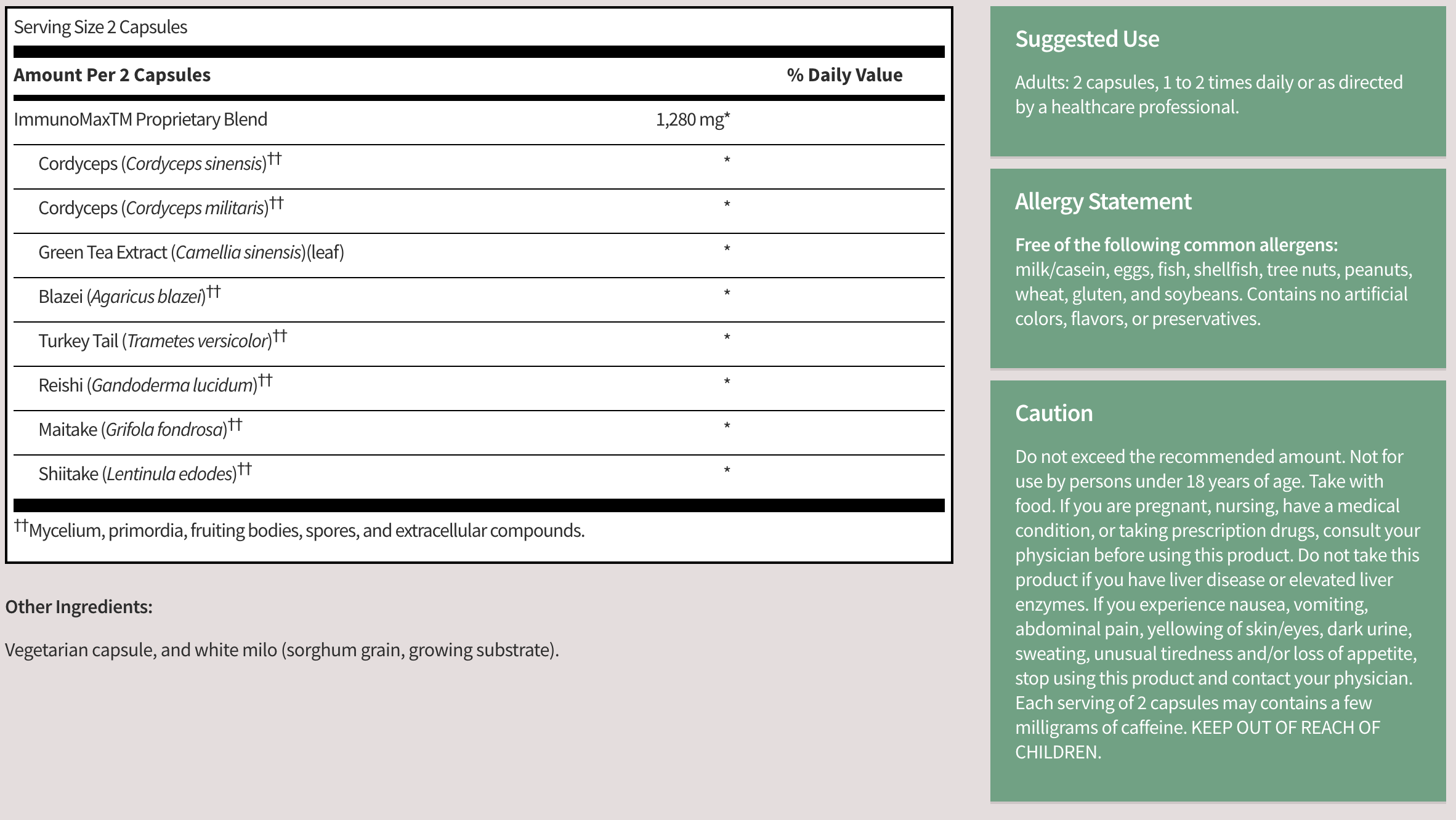 Immunomax Capsules supports immune health with a blend of highly researched and effectively concentrated mushroom extracts combined with the polyphenol nutrient support of green tea.† This powerful combination supports your natural immune function with the power of beta-glucans, digestive enzymes, prebiotics, antioxidants, and other important nutrients.† Grown in the USA under rigidly controlled conditions, these mushroom extracts are made with 100% certified organic ingredients.ÂÂ