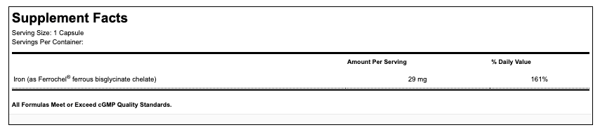 Iron bis-glycinate is a well-studied, 100% fully-reacted, patented form of iron exclusively from Albion® Laboratories. The amino acid glycine is actually one of the two starting materials the body uses to synthesize hemoglobin. Therefore, Iron Glycinate™ contributes two key factors. This form of iron has higher bioavailability, lower toxicity, less food reactivity, less food interactions and has a longer shelf life than any other common form of iron.*