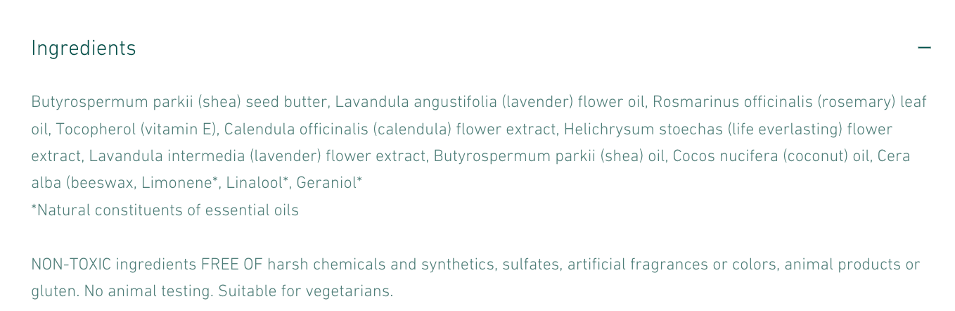 Suitable for the face and the body, unrefined nutrient-rich shea butter from Ghana marries with coconut oil and helichrysum flowers to feed the body’s landscape with rejuvenating plant-powered skin food, while lavender oil restores and soothes the skin and the mind.