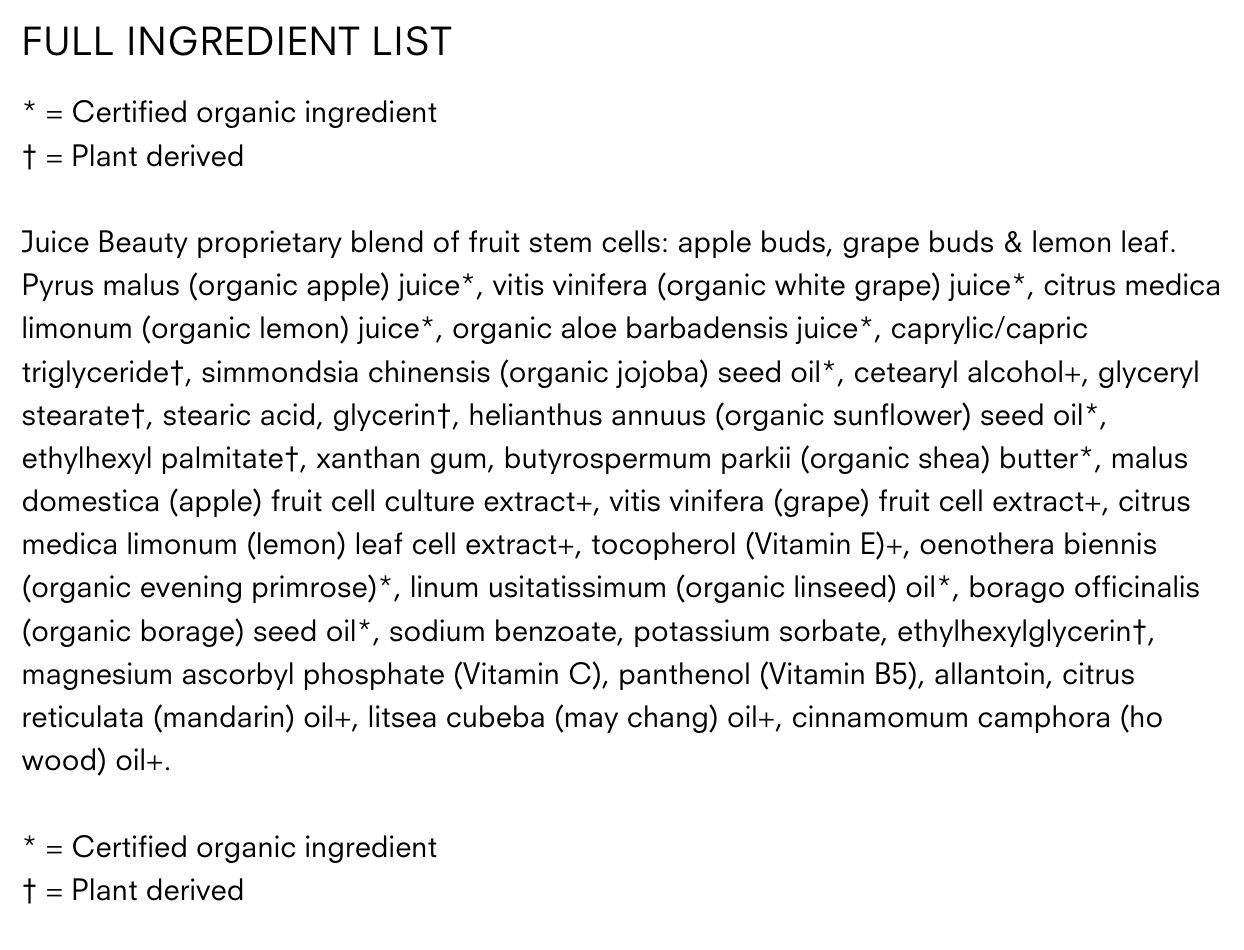 - A proprietary blend of fruit stem cells and Vitamin C infused into organic resveratrol-rich grape can improve the appearance of skin tone and luminosity.