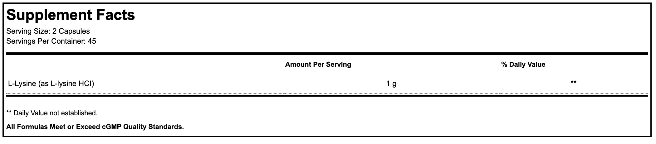 L-Lysine is an amino acid essential in human physiology. Lysine is vital for normal growth and for the manufacture of collagen, a substance important for healthy skin, bones, tendons, and cartilage. Supplemental lysine may be appropriate for individuals on a high-arginine diet.