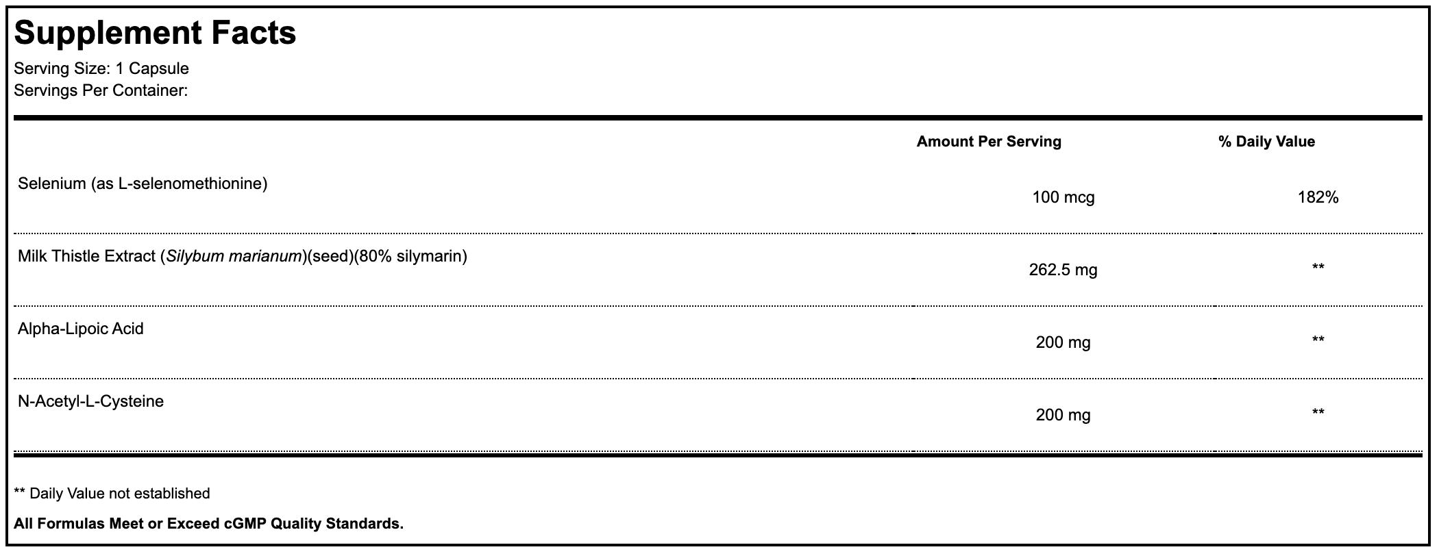 Liver Protect™ contains the amino acid N-acetyl-L-cysteine, a key component of glutathione—a tripeptide that plays a significant role in detoxification and antioxidant support. Liver Protect also contains a combination of alpha-lipoic acid, silymarin from milk thistle, and selenium for support of antioxidant activity, regeneration of other antioxidants, and promotion of healthy immune function.
