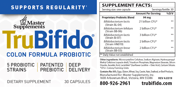 TruBifido® contains 30 billion CFU of Bifidobacteria to promote colon health. The five strains selected were chosen for their superior efficacy and compatibility with each other, and they work together to support regularity, immunity, and fortify your colon so you can stay well.