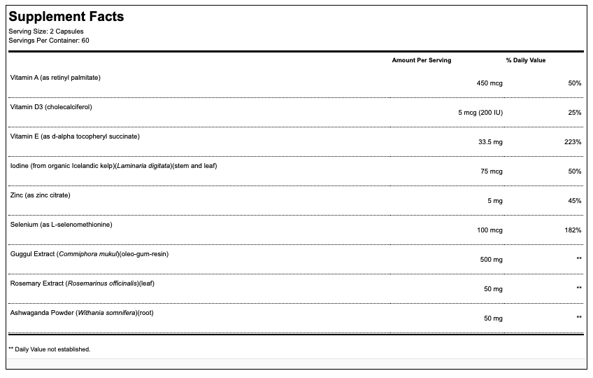 MedCaps T3™ features targeted nutrients and herbs that support healthy thyroid hormone biosynthesis. This combination may facilitate the expression of thyroid hormone genes. The addition of ashwagandha and guggul extract may aid in the conversion of thyroxine to triiodothyronine (T4 to T3) and may assist in maintaining healthy blood lipid levels already within the normal range.