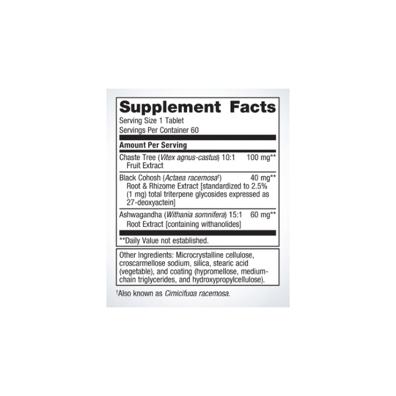 Each tablet contains 100 mg of chasteberry fruit extract, known for its supportive role in menstrual health.* Alongside this, we've included 40 mg of black cohosh root and rhizome extract, standardized to 2.5 percent total triterpene glycosides. This powerful combination works to provide menstrual relief and support reproductive health in women.*